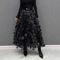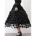 This black polka dot mesh midi skirt for women combines playful texture with chic design, making it a standout addition to your wardrobe. The layered mesh fabric with bold polka dot appliqués adds volume and movement, perfect for creating eye-catching looks.