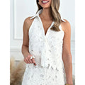 Elevate your wardrobe with this white lace halter top and wide leg pants set for women. Designed with delicate lace details and a breezy silhouette, this two piece set blends sophistication with everyday comfort.