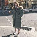 Stay warm and stylish through the colder months with this sage green long puffer coat designed for women. Featuring a fur-trimmed hood and oversized fit, it combines comfort with practicality for everyday wear.