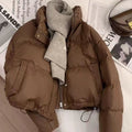 Stay warm and stylish with this khaki puffer jacket designed with a modern cropped cut and a protective stand collar. Perfect for layering during colder days, this jacket combines comfort and function with a trendy appeal.