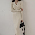 Embrace style and comfort with this ivory ribbed button-down knit dress for women. The soft, stretchy fabric and flattering fit make it an easy-to-wear option for any casual outing or relaxed day at home.