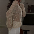 This beige sheer knit sequin long sleeve top for women brings together a lightweight design and subtle sparkle. Perfect for layering or wearing on its own, it adds a modern twist to casual and chic outfits.