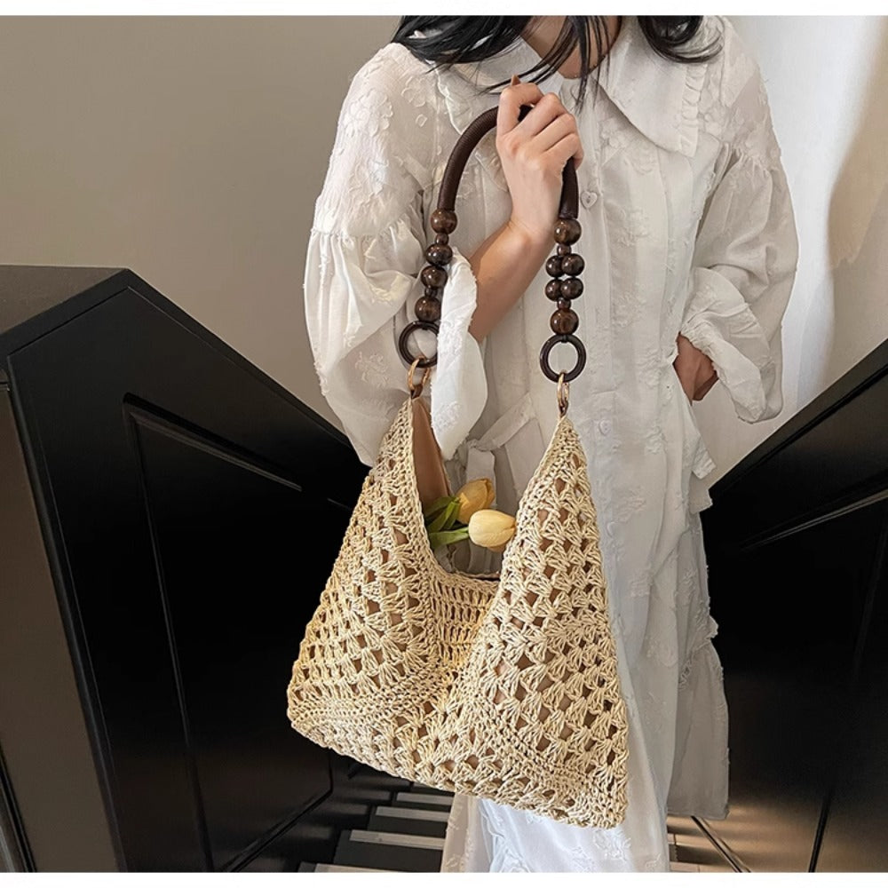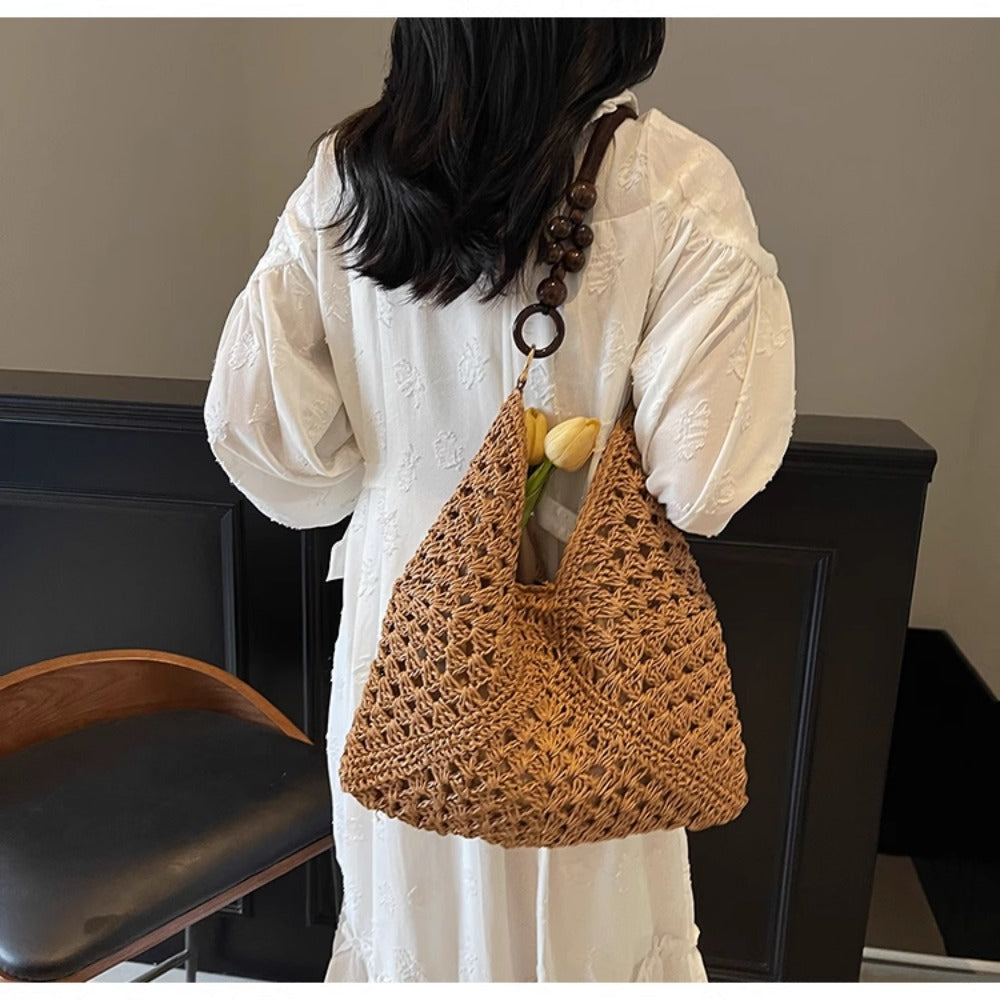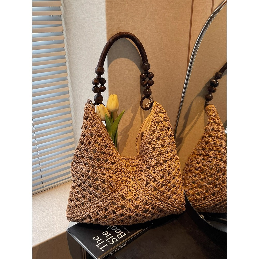 Woven Straw Shoulder Bag with Crochet Design for Women - Camilla