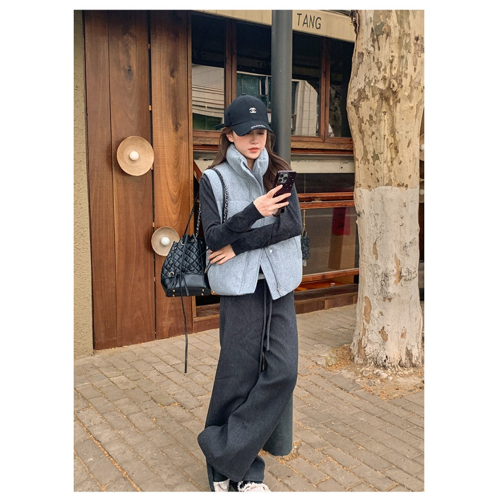 Stay cozy and on-trend with this gray zip up puffer vest with high collar for women. Perfect for layering, this versatile vest combines warmth with casual style, making it an essential piece for cooler weather.